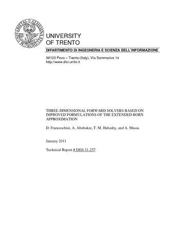 Franceschini, Davide and Abubakar, Aria and Habashy, T.M. and Massa, Andrea (2011) Three-Dimensional Forward Solvers Based on Improved Formulations of the Extended Born Approximation. [Technical Report]