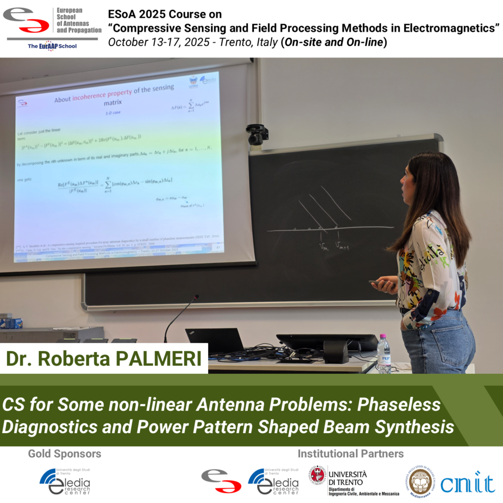 Today, Dr. Roberta PALMERI delivered an insightful lesson on “CS for Some non-linear Antenna Problems: Phaseless Diagnostics and Power Pattern Shaped Beam Synthesis” during the ESoA 2025 Course on Compressive Sensing and Field Processing Methods in Electromagnetics.