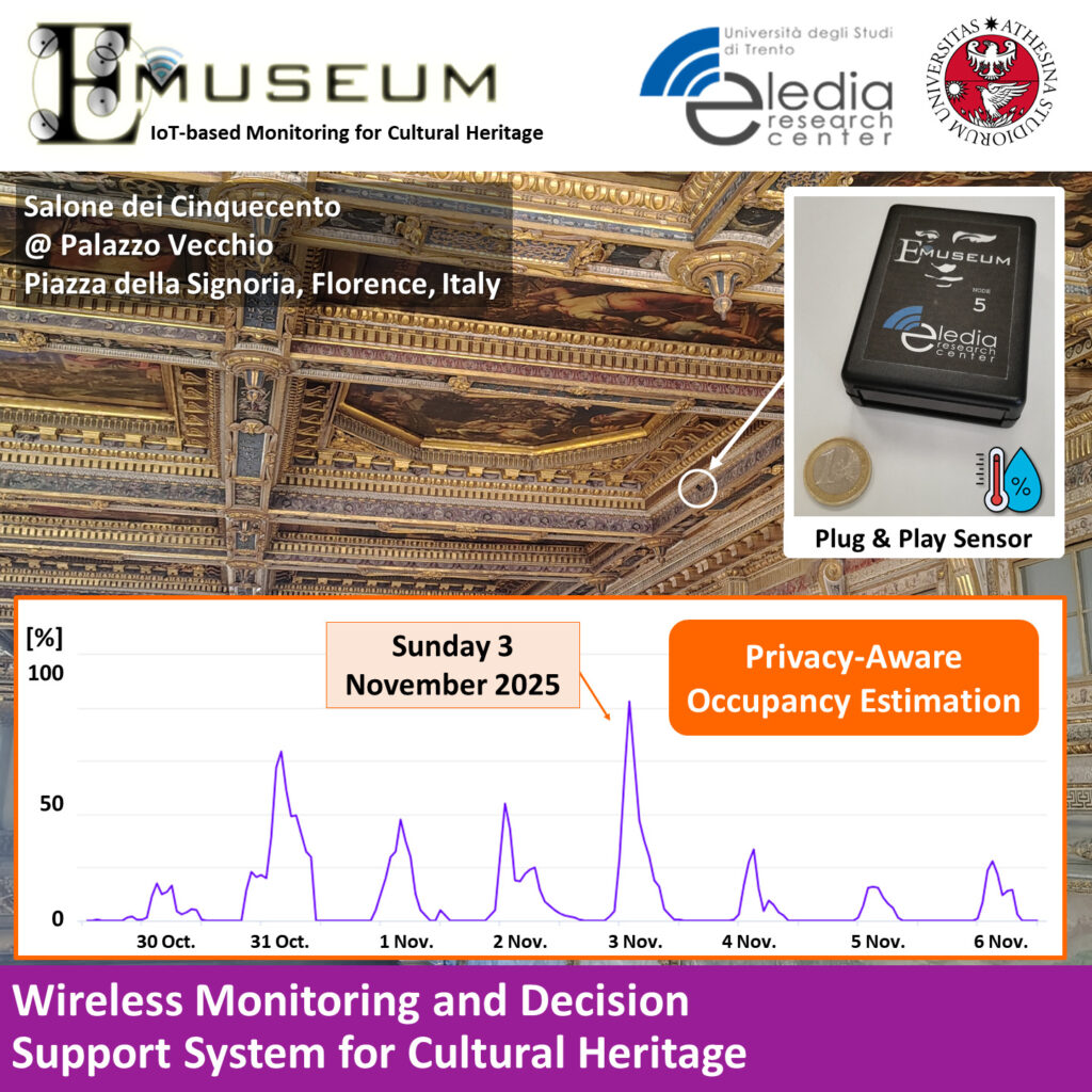 Grazie ai dati ambientali opportunistici (temperatura, umidità) acquisiti dai sensori wireless, E-MUSEUM è in grado di stimare l’utilizzo degli spazi in tempo reale: