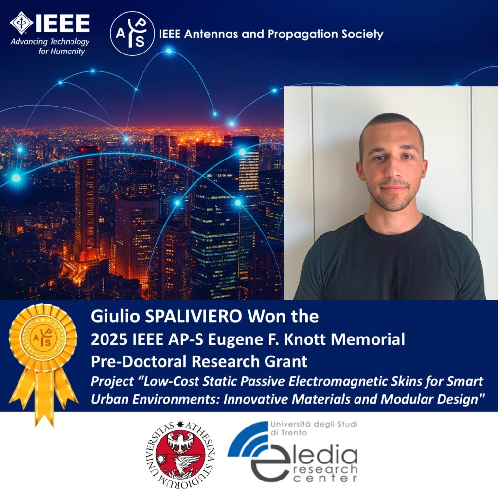 We are pleased to announce that Giulio SPALIVIERO has won the 2025 IEEE Antennas and Propagation Society (AP-S) Eugene F. Knott Memorial Pre-Doctoral Research Grant for his research project “Low-Cost Static Passive Electromagnetic Skins for Smart Urban Environments: Innovative Materials and Modular Design” under the guidance of Prof. Andrea MASSA!