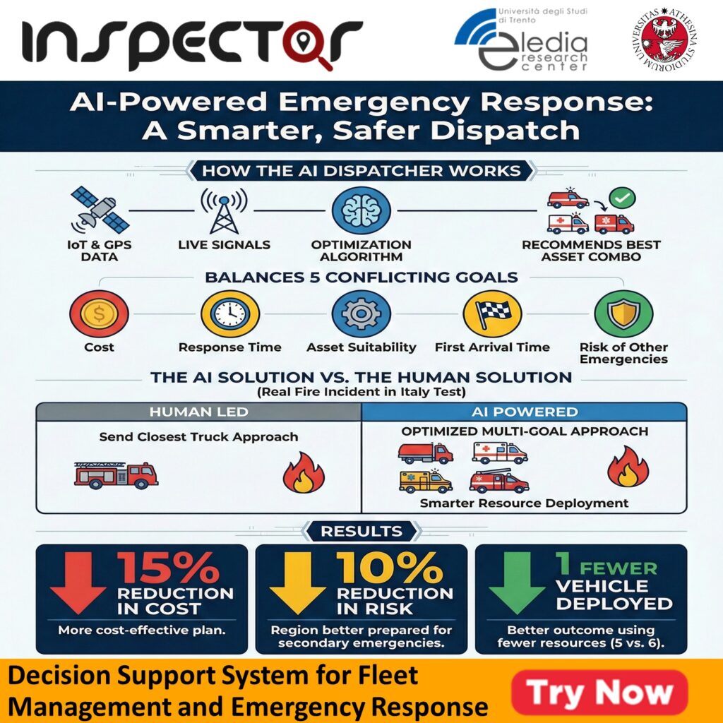 Instead of “send the closest truck”, INSPECTOR evaluates cost, response time, risk, coverage, and readiness — all at once — and proposes the best combination of assets for this moment.