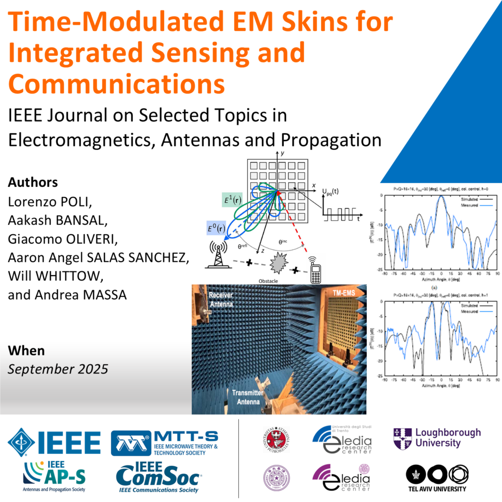 L. Poli, A. Bansal, G. Oliveri, A. A. Salas-Sanchez, W. Whittow, and A. Massa, “Time-modulated EM skins for integrated sensing and communications,” IEEE Journal on Selected Topics in Electromagnetics, Antennas and Propagation – Issue on ‘Integrated Sensing and Communications (ISAC),’ Invited Paper, vol. 1, no. 1, pp. 237-248, September 2025 (DOI: 10.1109/JSTEAP.2025.3605882).